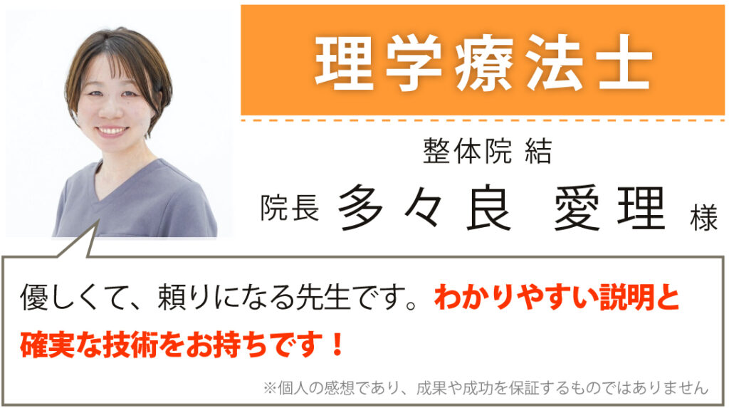 中長期の施術プランの説明も分かりやすく、セルフケアの方法も教えていただき、大変感謝しています。