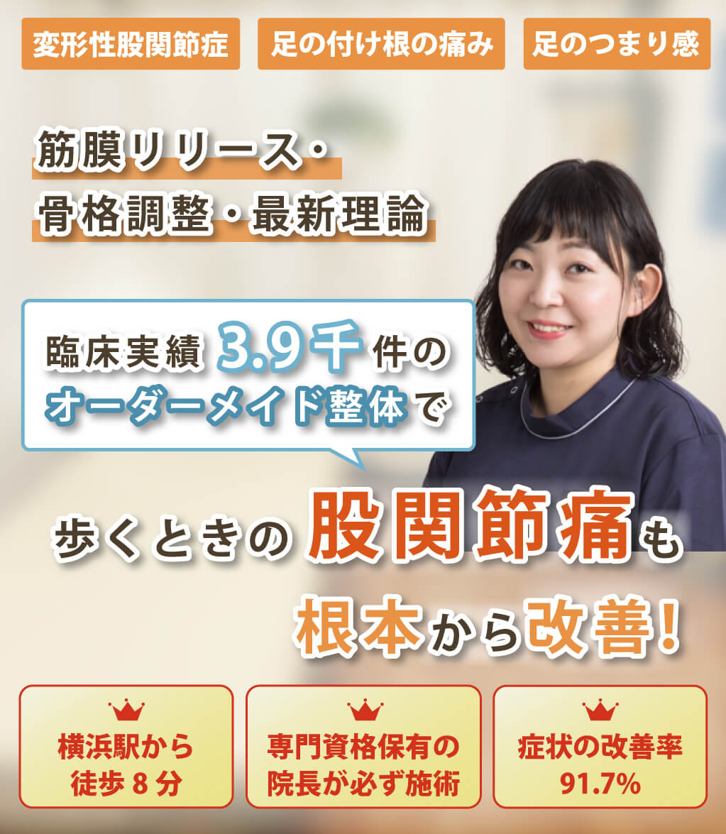 変形性股関節症、足の付け根の痛み、つまり感など股関節の痛みの施術経験が豊富な整体院です。施術して終わりではなく、その後の自宅でできるセルフストレッチや生活習慣の指導もいたします。